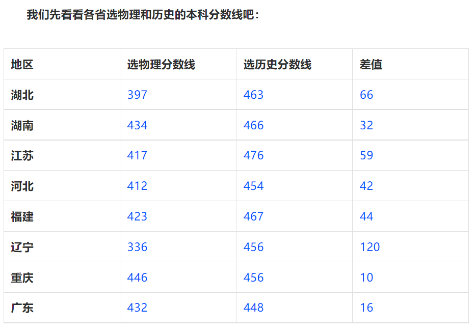 我们再来看看和湖北一样,今年实行新高考一些省份的物理、历史本科分数线,可以看到历史类均高于物理类,最夸张的是辽宁,差值达到了120分。