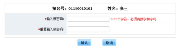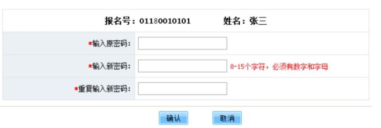考生输入原密码(字母区分大小写)、新密码、重复输入新密码,新密码和重复输入新密码必须一致。新密码必须为数字和字母的组合,长度为8--15位,输入完成后点击“确认”按钮,输入正确后密码修改成功,返回登录页面。