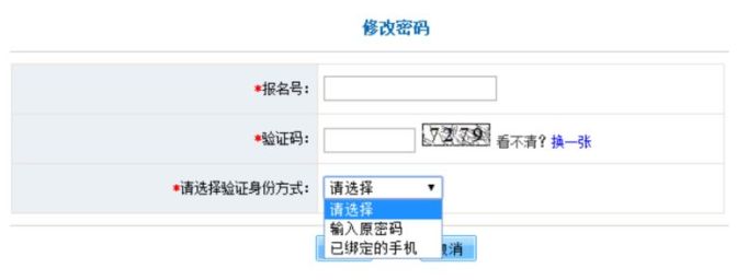 输入报名号、验证码,选择验证身份方式。验证身份方式有两种选择:考生记得原密码或密码已被重置成出生日期时,选择“输入原密码”验证方式;已绑定手机号的考生忘记原密码时,选择“已绑定的手机”验证方式。