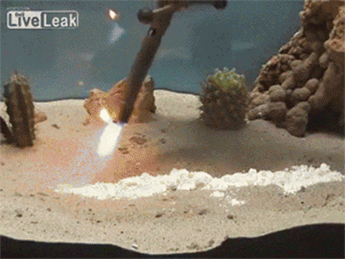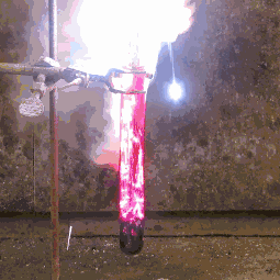 录制者:The University of Minnesota,The Department of Chemistry原理:不必多说,这就是中学化学中感觉最炸裂、最让人印象深刻的反应了!铝粉与氧化铁粉末混合制成铝热剂,通过插在其中的镁条引燃。铝还原氧化铁,反应剧烈放热,光芒耀眼、火花四溅,得到熔融的铁单质。其他一些金属(例如锰)的氧化物同样可以发生反应。反应式:2Al + Fe2O3 → Al2O3 + 2Fe花絮:除了焊接铁轨、冶炼金属等用途之外,铝热反应产生的极高温度也曾被用来制造武器。危险:高。铝热反应可以在局部产生几千度的高温,在没有专业保护、没有按规程操作时,这会非常危险。在网络上,我们可以找到大量铝热反应的实验视频,其中有的看起来简直帅到不行,让人恨不得立刻亲身体验,但必须严肃指出的是,这些“酷炫”的视频很多都没有遵守安全原则。这真的很危险,请一定不要模仿!