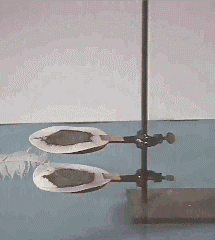 原理:白色粉末歘地一下消失了!这不是升华,而是碳酸铵的热分解。产物是氨气、二氧化碳和水蒸气,所以看起来就消失得了无痕迹了。当然,如果你提鼻子一闻的话……碳酸铵遇热相当不稳定,在60°C左右就可以分解。反应式:(NH4)2CO3 → 2NH3↑ + CO2↑ + H2O↑花絮:基于同样的原理,碳酸氢铵也被作为一种食品膨松剂使用,不过如果使用不当、没有让氨气完全散去,它就会给食物留下糟糕的气味……
