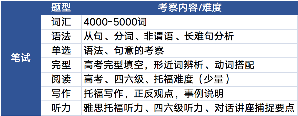 笔试的语用和阅读部分一般是高考难度,包含很多题型(语法、单选、完型),会注重词汇和语法的考察,毕竟词汇和语法是英语学习和能力的基石,基础不扎实对输入和输出都有影响。输入表现在阻碍理解,看不懂或听不懂文章和题目,影响输出表现在写作口语无词可用或表达不精准。笔试的听力和写作部分一般是托福难度,有些学校会直接拿托福题作为加试题,对于初中毕业生来说,难度还是比较大的。总结一下,笔试考察一个孩子是否具备用英语学习其他学科知识的能力,AP、IB、A-level等课程的学习离不开扎实的语言能力。如果基础的英语能力都不达标,那么学生是很难学好标化及国际课程的。