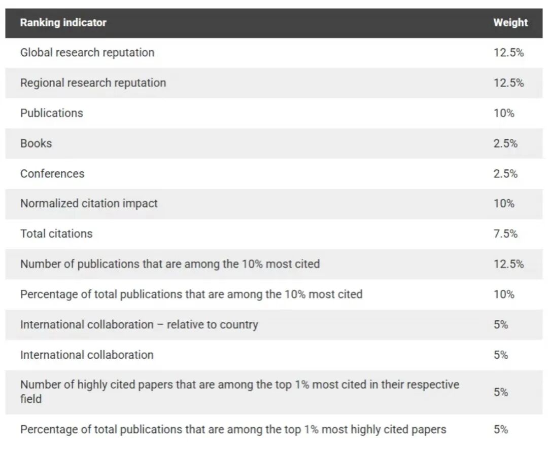 全球科研声誉 (Global research reputation) 占比12.5%,代表来自全球学术界的声誉调查,体现学校在全球范围内的学术影响力。
