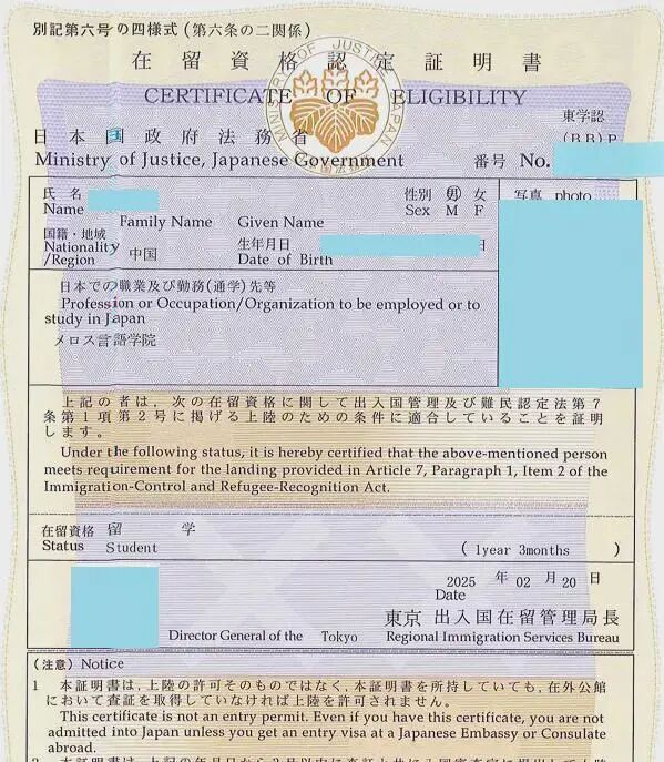 在留资格认定证明书是什么? 这是由日本入国管理局审核签发的“赴日资格许可”,是你能够去日本的“许可证”。 谁申请? 通常由你在日本的录取院校(语言学校/大学/专门学校)作为你的代理者,向入管局提交申请。 关键点: 这是整个流程中最关键、最容易出问题的一环,准备材料必须万无一失。 办理【正式签证】 正式签证是什么? 拿到“在留资格”后,你需要到国内的日本驻华使领馆,把这个“许可证”贴到你的护照上。 谁申请? 学生本人亲自或通过代办机构(如使馆指定的旅行社)申请。 关键点: 此步骤主要是审核你的个人背景,材料相对简单,通过率极高。