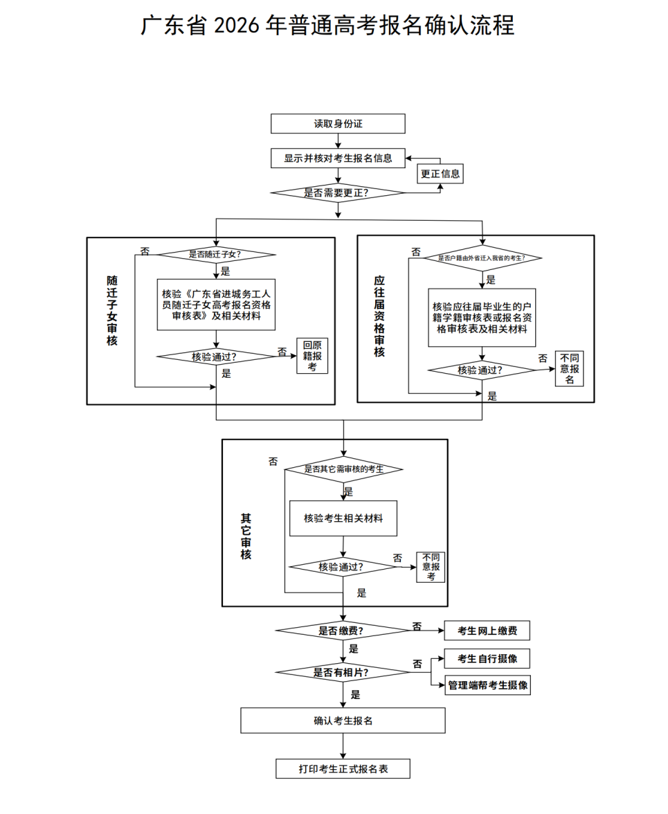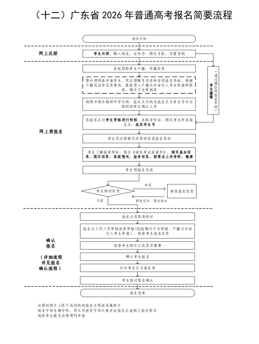 2026年广东省普通高校招生统一考试报名时间为:2025年11月1日至10日。考生报名包含系统注册、网上报名和确认报名共3个步骤,其中系统注册和网上报名的时间为:11月1日至10日,确认报名时间:11月6日至10日。考生网上报名前,需先进行注册,报名系统网址为 https://pg.eeagd.edu.cn/ks。 广东省2026年普通高考报名简要流程 广东省2026年普通高考报名确认流程 要准备哪些报名材料? 高考报名报考问答 一起来看 01 考生报名基本流程是怎么安排的? 2026年高考报名基本流程分为四个部分:考生注册、报名资格初核、网上报名、确认报名。 02 广东2026年普通高考报名什么时候进行? 2026年我省普通高校招生统一考试报名时间为:2025年11月1日至10日。考生报名包含系统注册、网上报名和确认报名共3个步骤,其中系统注册和网上报名的时间为:11月1日至10日,确认报名时间:11月6日至10日。 03 错过11月的高考报名时间,还能补报名吗? 一般情况下,我省将于次年初安排一次高考补报名。鉴于补报名时我省体育、艺术类专业考试省统考、普通高等学校招收中等职业学校毕业生统一考试(即“3+证书”考试)和普通高中学业水平合格性考试(即依学考成绩录取)已经结束,拟报考上述招生考试类型的考生不列入补报名范围。详情请密切关注广东省教育考试院官微、官网发布的相关通知。 04 高考注册和报名的网址是什么? 高考注册和报名的网址是:https://pg.eeagd.edu.cn/ks。 05 报名前应做好哪些准备? 核查户籍身份信息真实准确性。所有考生在高考报名前应与父母或家人核查本人户籍是否存在双重户籍和虚假户籍,确保以唯一真实有效户籍身份信息进行高考报名,以免在高考报名或录取后因双重户籍或虚假户籍等原因被取消高考报名和录取资格。 06 考生报名时,要注意哪些问题? (1)2025年11月1日至10日,考生应先进入广东省普通高考报名系统(网址为:https://pg.eeagd.edu.cn/ks),凭姓名、证件号注册考生账号,设置密码,并绑定手机号。 (2)考生注册及预报名后必须进行报名确认。凭个人证件号码或注册时填报的手机号码和注册时设置的密码登录广东省普通高考报名系统进行网上报名。网上报名时,考生须认真阅读报考须知,签订《考生诚信考试承诺书》,并按系统指引,录入本人的基本信息(含普通高中学业水平考试选择考科目在内的报考信息、联系方式、个人简历、家庭情况等),上传身份证、户口簿等身份证明材料(其中身份证号44开头的广东户籍考生如经报名系统核查户籍信息验证通过的,无需上传),采集考生相片,并缴纳报考费。上传的报名材料支持JPG/PNG/PDF文件格式,大小不超过2M,其中身份证要求上传正反两面、户口簿要求上传首页、户主页、父/母亲或监护人页、考生本人页,考生可提前准备好电子文档,方便报名时上传。 网上报名完成后,考生还须在规定时间内持二代(或三代)身份证、户口簿、学籍学历等证明材料到学校、社会报名点办理确认报名手续。确认报名手续包括确认报名资格、校对和核准报考信息等。具体报名办法按《广东省2026年普通高校招生统一考试报名实施细则》进行。 (3)考生个人信息必须准确无误。考生身份证信息统一采用身份证阅读器采集,考生相片和人脸特征信息数据通过省普通高考报名系统和省教育考试院官微小程序采集。考生报名信息准确与否和人脸信息的正确采集,直接关系到考生的切身利益。考生的考试、录取以及升学后的学籍管理和毕业证书电子注册,都将以考生网上确认的报名信息为准。在报名现场信息确认时,学校、社会报名点会打印出考生的报名信息表供考生核对确认,考生必须认真校对、核准全部信息,如因个人信息错误、失真造成不良后果,责任由考生承担。 校对核准的主要内容:考生本人的姓名、身份证号码、性别、户籍所在地、毕业学校、考生类别、报考科目等信息。 07 高考报名后发现报考信息填错,或高考报名后姓名、证件号、户籍、政治面貌等信息有变化,要怎么修改? 报考信息非常重要,信息错误将造成严重后果,报名时请务必认真核对报考信息,报名后如个人信息发生变化须及时主动申请修改。具体请联系报名点或当地市县招生办,按照“广东省2026年普通高考考生信息修改审核流程”进行更正,信息更正办理时段为报名结束后至2026年4月30日以及2026年6月10日至6月12日(注:开考后不再受理高考报名所使用户籍被注销考生的修改信息申请),因考生未及时提交修改信息申请而造成的遗留问题由考生本人承担责任。 08 高考报名后,更改姓名是否有影响? 高考报名后,不建议再更改姓名。高考报名系统所填姓名信息是高考录取、高校入学报到、高校学籍电子注册的主要依据,如更改,可能带来一系列的问题。如确实需要更改姓名,建议在高考报名前或高校入学报到注册后更改。 09 考生因为虚假户口办了新的身份证号且修改了姓名,但其他报名材料上是旧的身份证号和姓名,会对后续录取有影响吗? 报名时,考生须提供真实的报名材料,普通高考考生须对报名材料信息的真实性负责。使用虚假户籍报考,按规定将取消报考、录取和入学资格,考生报名前应与家人核实是否存在双重户籍或虚假户籍情况。报名后至开考前如因双重户籍或虚假户籍等原因更改了身份证号或户籍信息等,应立即向高考报名点报告并提出身份证号或户籍更正申请及相关