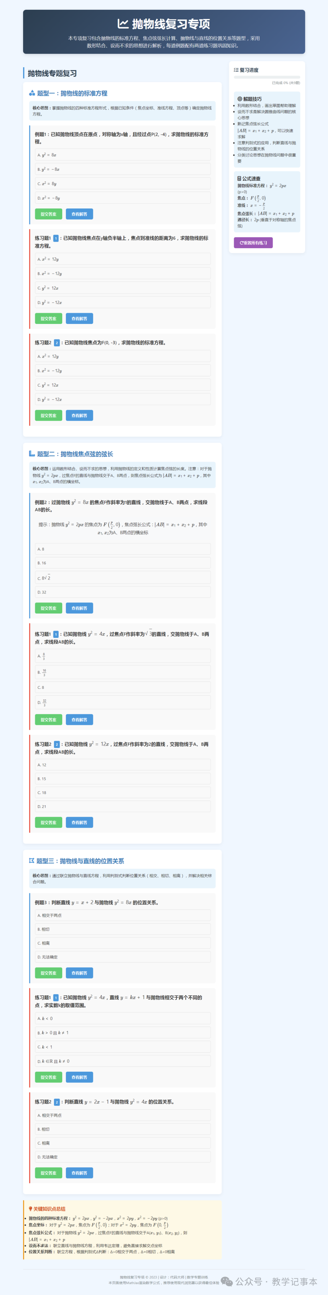 DeepSeek给出代码后,点击运行。看是否符合要求,不满意,就优化程序。第一次焦点弦的计算给出的公式要用夹角,不符合要求,又修改了一次。提示词:将焦点弦的题目倾斜角改为斜率k,公式改为x1+x2+p,相应地更改解析过程。最后生成的结果如下图所示。学生基础较差,因此题目都很简单。