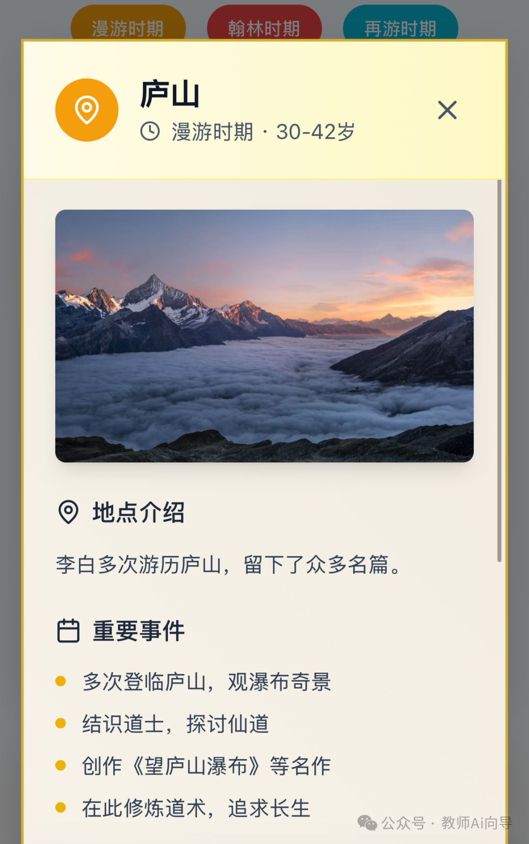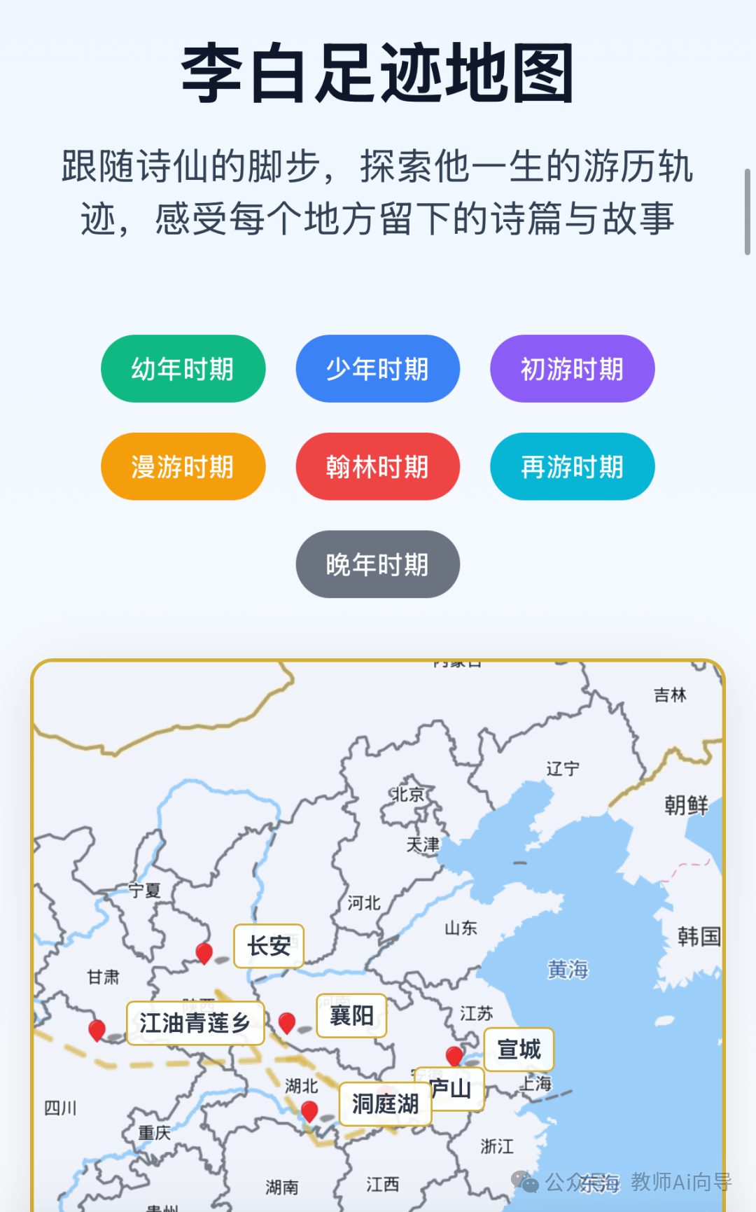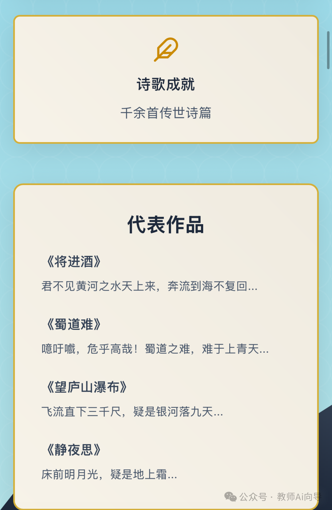 作为高中语文老师,不再是带学生读师,理解诗意,了解作者生平事迹更能帮助学生理解古诗词创作背景及含义,张老师制作的李白生平介绍系统,不仅介绍了李白的成就、诗词,海详细写出了李白的生活轨迹,各阶段对应的历史事迹及古诗创作,将学生和诗人拉进,更清晰的了解诗人作诗背后的故事。