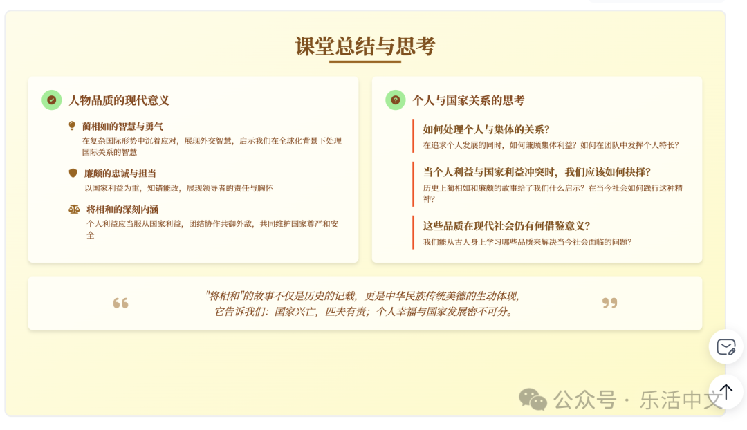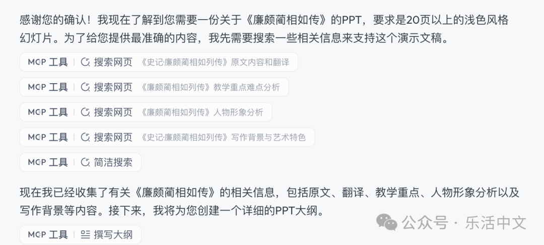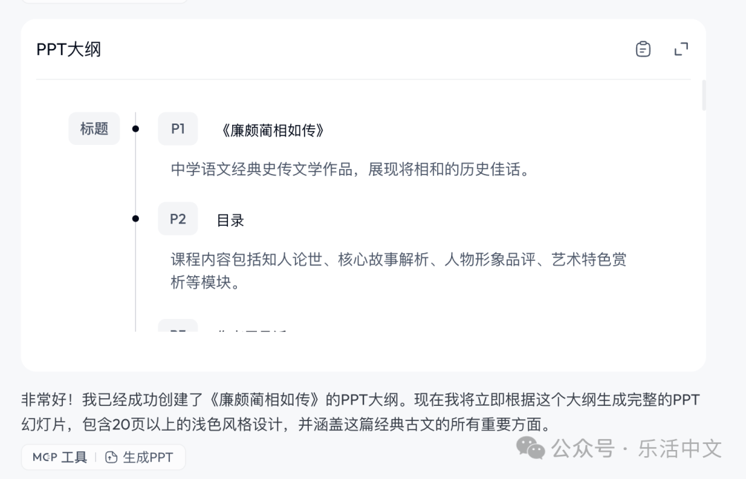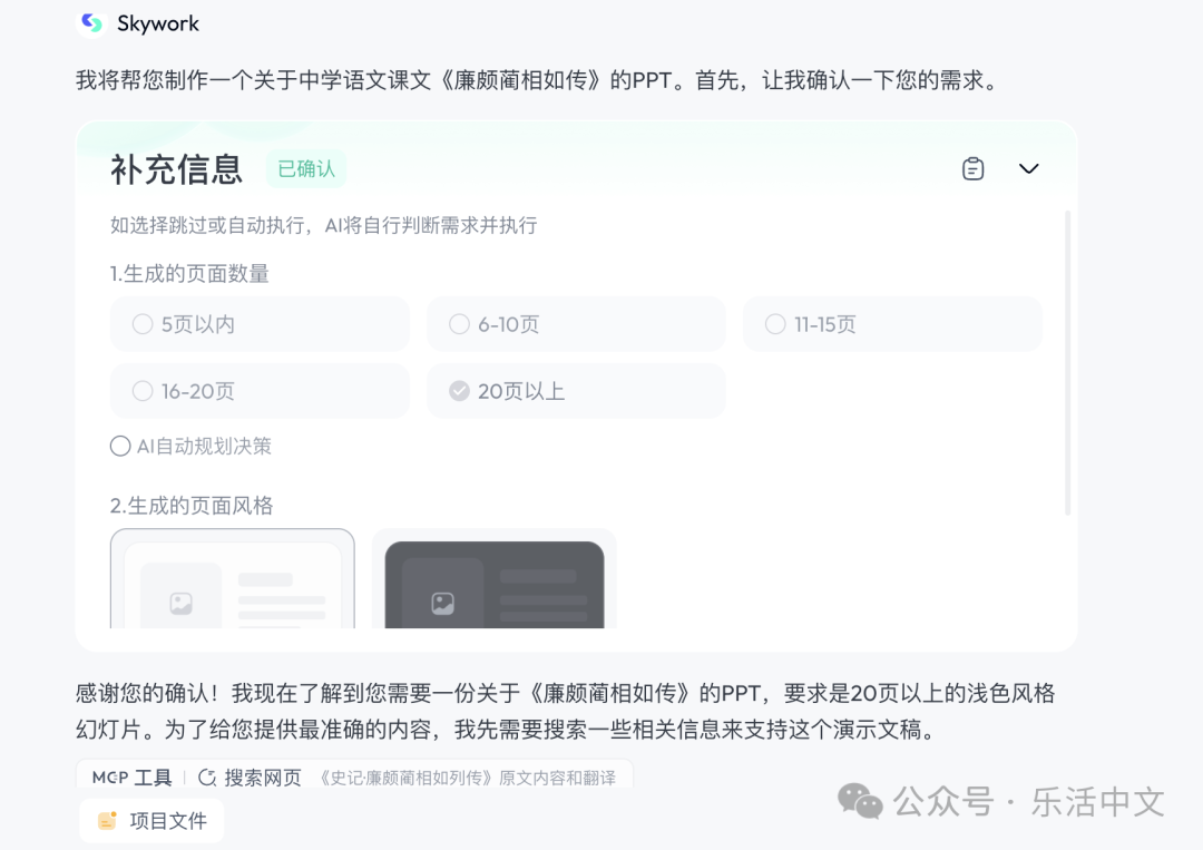 首先打开官网,找到下方的PPT模式,就自动进入PPT制作的智能体中: 我们来看看它的“思考过程”有多强大: 1. 需求澄清(它在听你说话) 进入网页选择PPT模式后,它不会上来就瞎做。它会先明确我的需求: 你需要生成多少页? 你喜欢的页面风格是什么样的?(国风、简约、教学风?) 2. 在确定需求后,它会自动调取搜索引擎。 它不是去搜“将相和的故事”,而是去搜《将相和》的教学分析”、“教学重难点”、“人物性格分析”。它在像一个老师一样,先理解这堂课该怎么教。 接下来就是奇迹产生的时刻!最让我头疼的找图环节,它全包了! 提到司马迁,它自动抓取司马迁的画像。 提到战国背景,它自动调取战国时期的地图。 你不需要跳出网页去百度找图,再一张张粘贴进来,Skywalk全自动帮你配好了图文。 (以上只是展示) 4. 生成的初稿如果哪里不满意,你不需要像以前那样进到复杂的编辑栏里调参数。 你可以在PPT上直接添加批注,就像给学生改作业一样告诉它:“这里换一张图片”或者“这里加一段分析”。它会根据你的批注,立刻进行调整。02 《将相和》课件制作