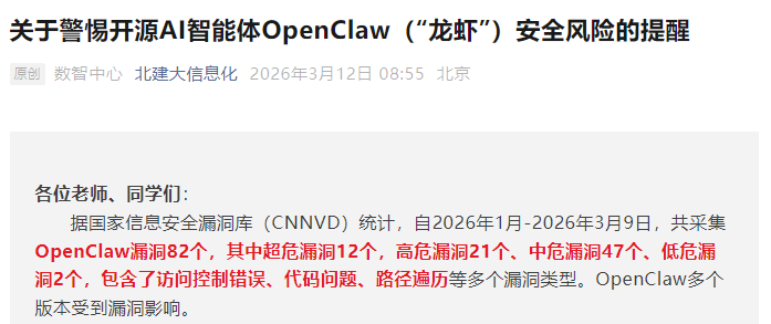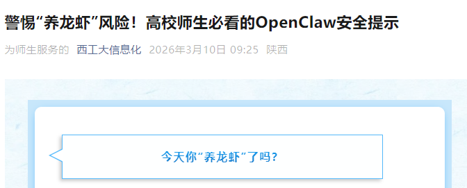 全校师生应结合自身实际需求理性看待该工具,切勿因跟风心理盲目安装、部署“龙虾”AI智能体,尤其避免在接入校园网的设备、办公电脑、存储有个人敏感信息和工作数据的设备上使用。