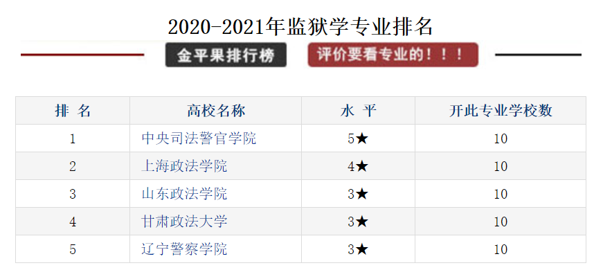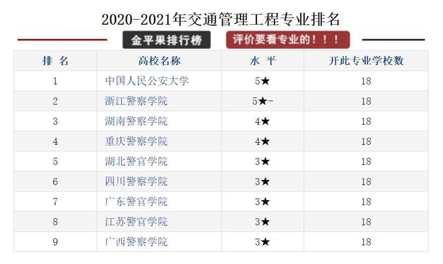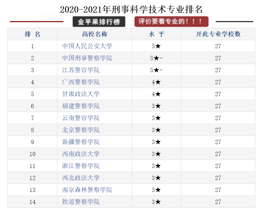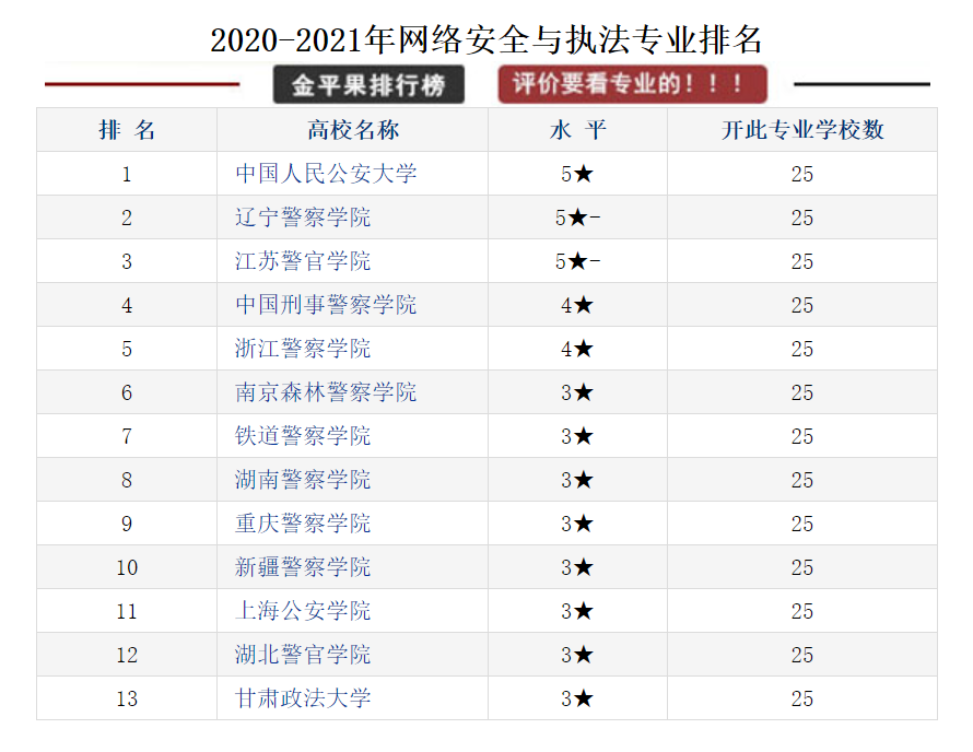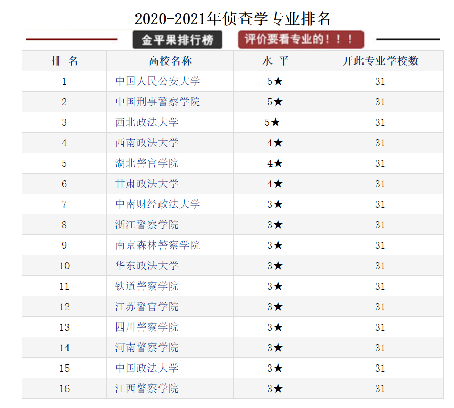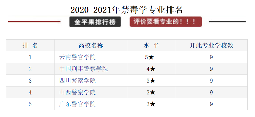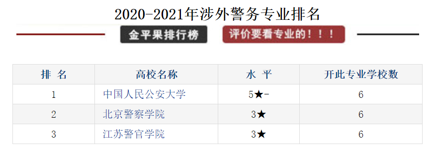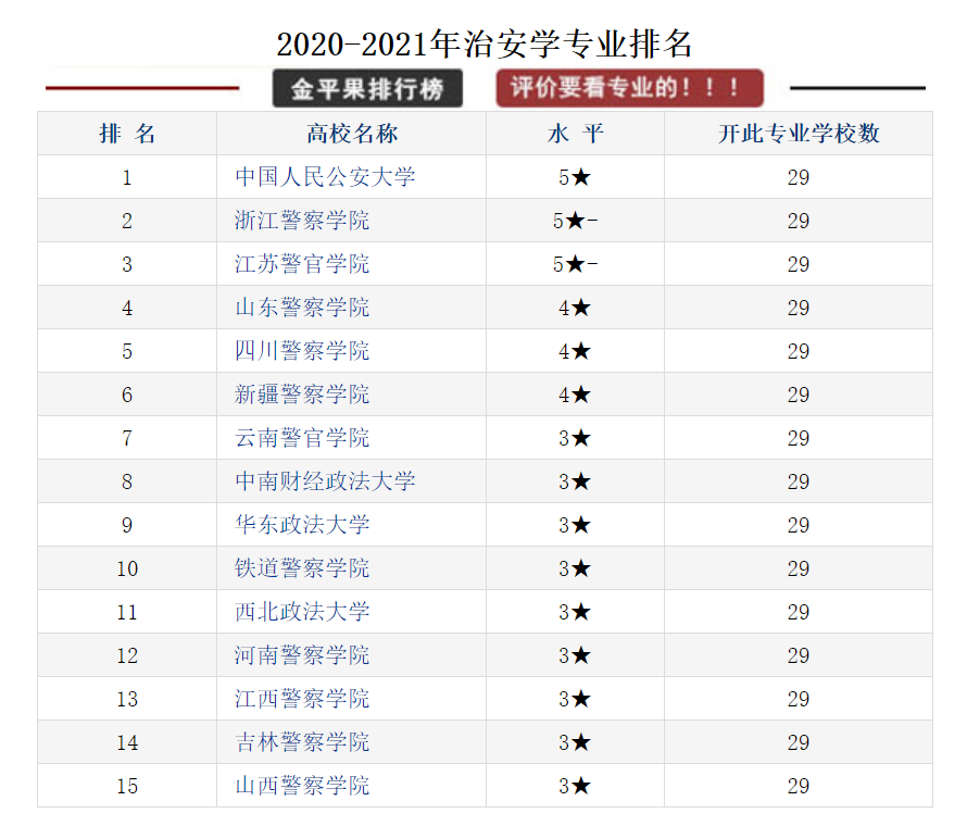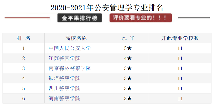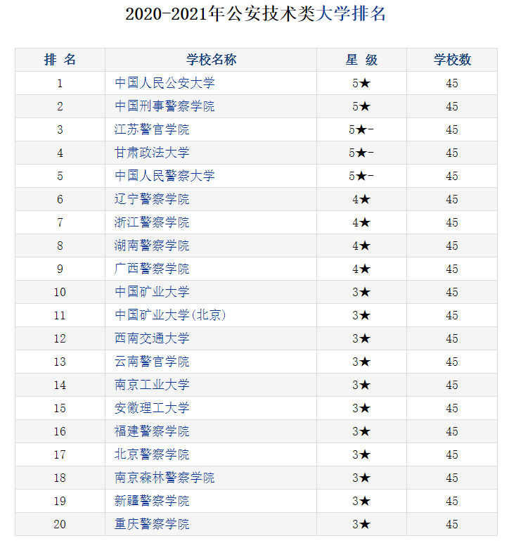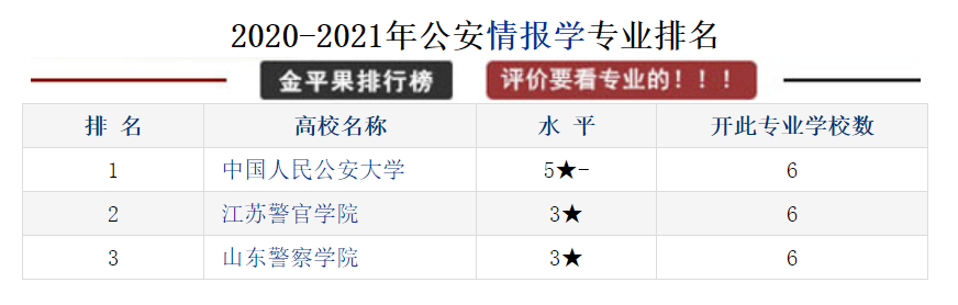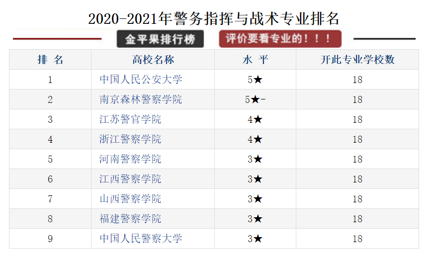 2020年3月,杭州电子科技大学中国科教评价研究院和浙江高等教育研究院、武汉大学中国科学评价研究中心联合中国科教评价网隆重推出《中国大学及学科专业评价报告(2020-2021)》。本次大学评价中,大学及学科专业的星级标记体系由5★+、5★、5★-、4★、3★、2★、1★组成,分别对应于大学或学科专业评价排名的前1%、1-5%、5-10%、10-20%、20-50%、50-90%、90-100%大学或学科专业。其中国内公安学类大学排名,以及警校专业最新排名如下: 封面来源:辽宁警察学院 本站内容收集整理于网络,多标有原文出处,本站仅提供信息存储空间服务。如若转载,请注明出处。